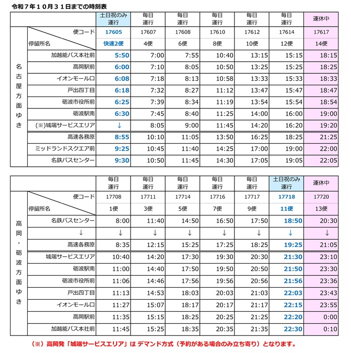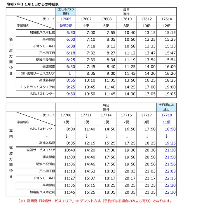 加越能バス本社前 高岡駅前 イオンモール口 戸出四丁目 砺波市役所前 砺波駅南 城端サービスエリア |