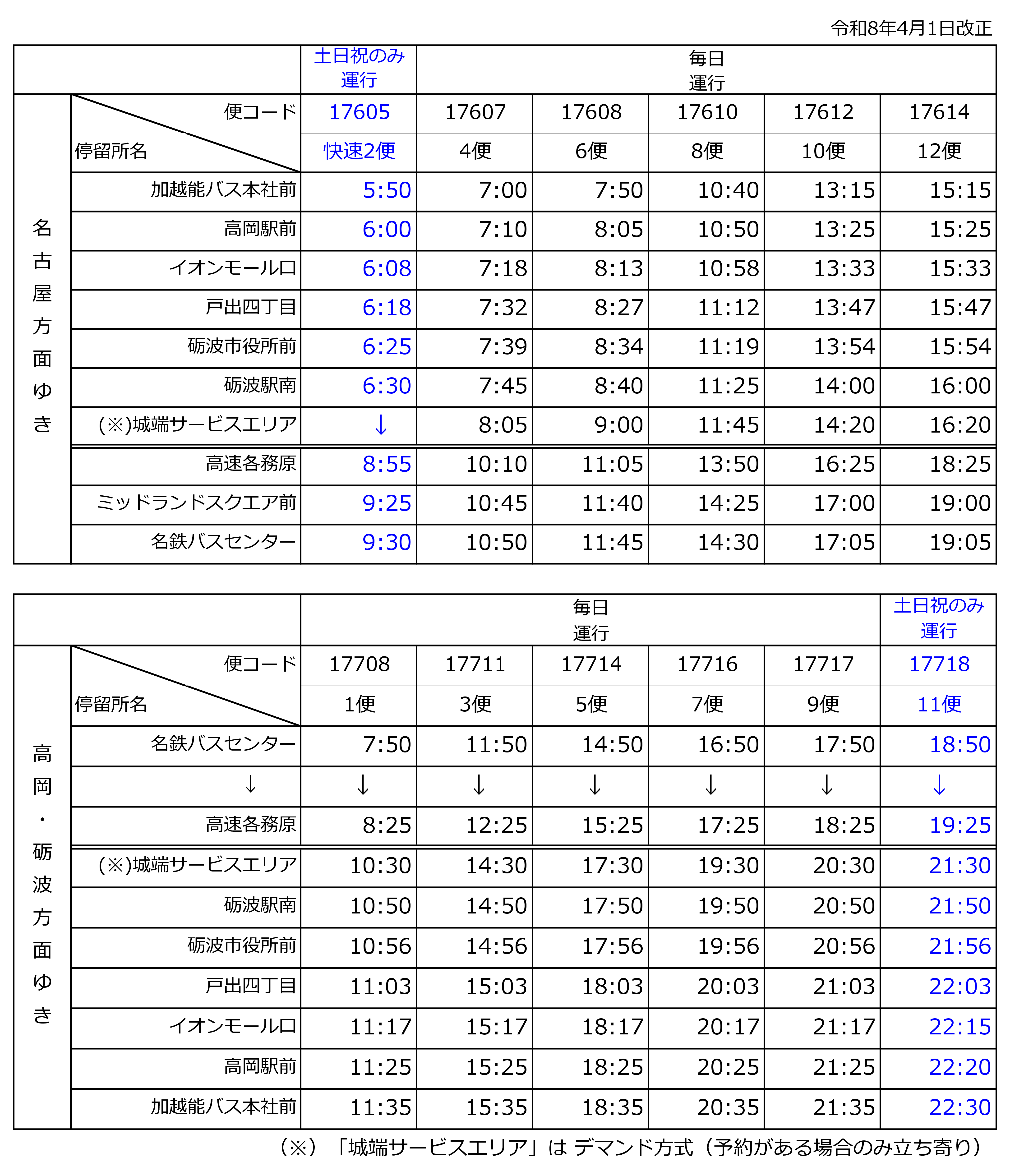 高 岡行1便 名鉄バスセンター 7:50発に変更(以降、10分繰り上げ)