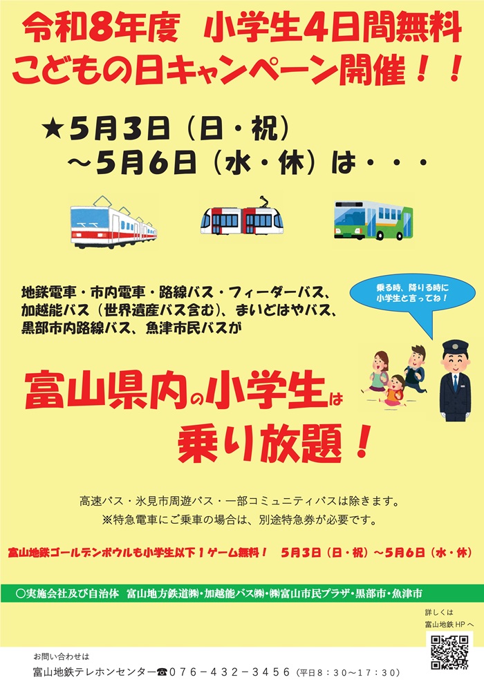 小学生無料!こどもの日キャンペーン実施(5/3~5/6) 2026.4.22 平素より加越能バスをご利用頂きまして、誠にありがとうございます。 ゴールデンウィーク期間中、「小学生4日間無料!こどもの日キャンペーン」を今年も開催いたします。 加越能バスと富山地鉄の鉄道・市内電車・バスが小学生運賃が無料となります。 この機会に公共交通を利用し、理解を深めていただければと思います。 ぜひ多くの子供たちにご利用頂けたら嬉しいです!ご利用お待ちしております! ← 前の記事へ 次の記事へ →