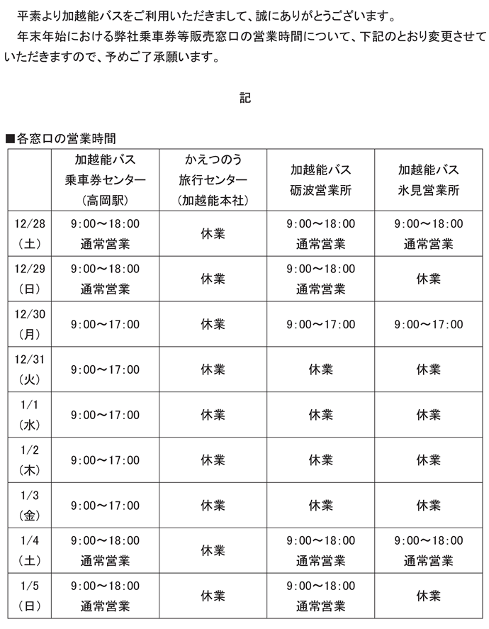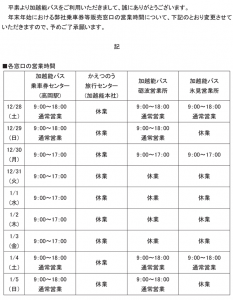 年末年始 販売窓口営業時間の変更について