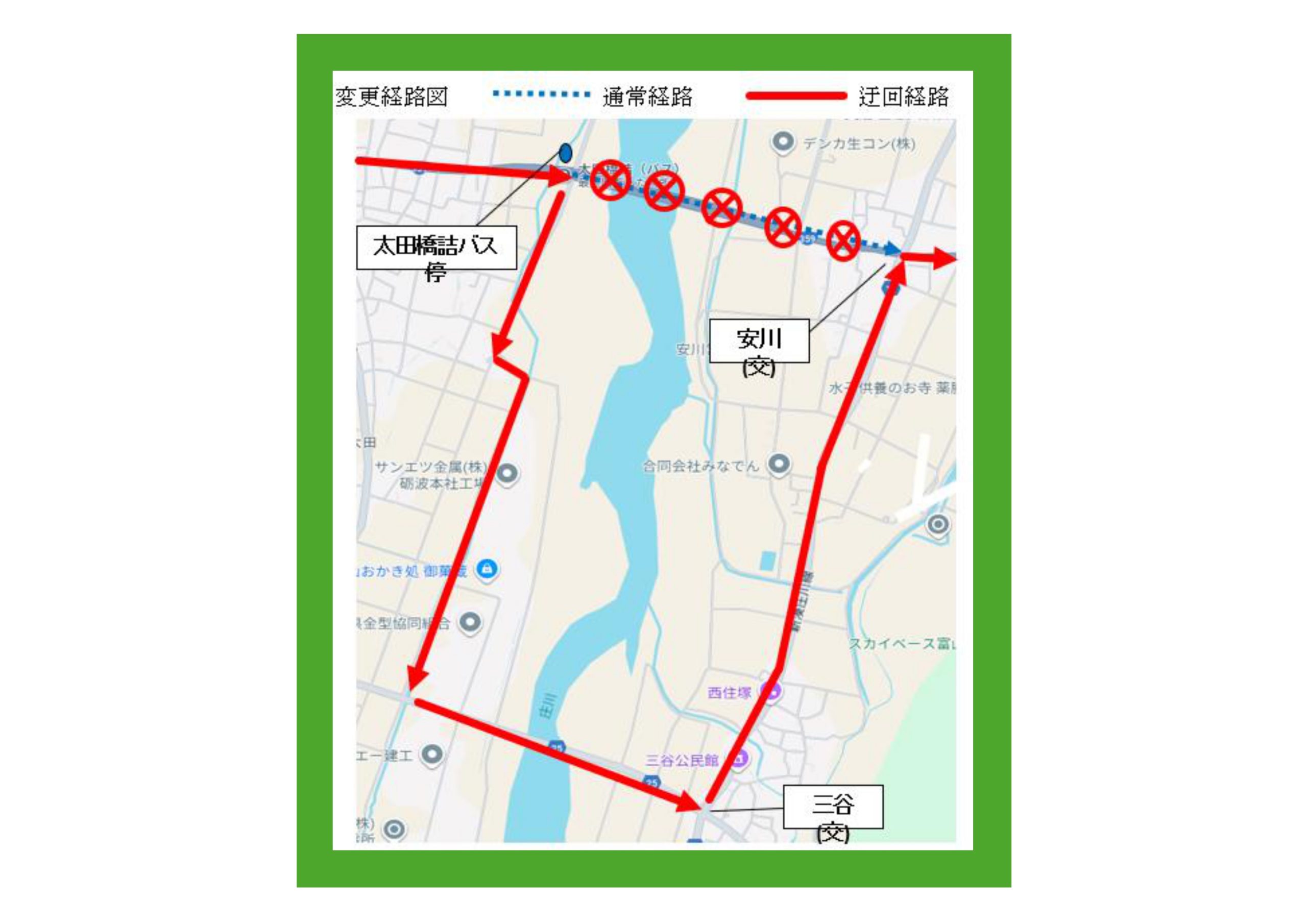 このたび太田橋の工事による通行規制の為、下記のとおり経路変更いたします。