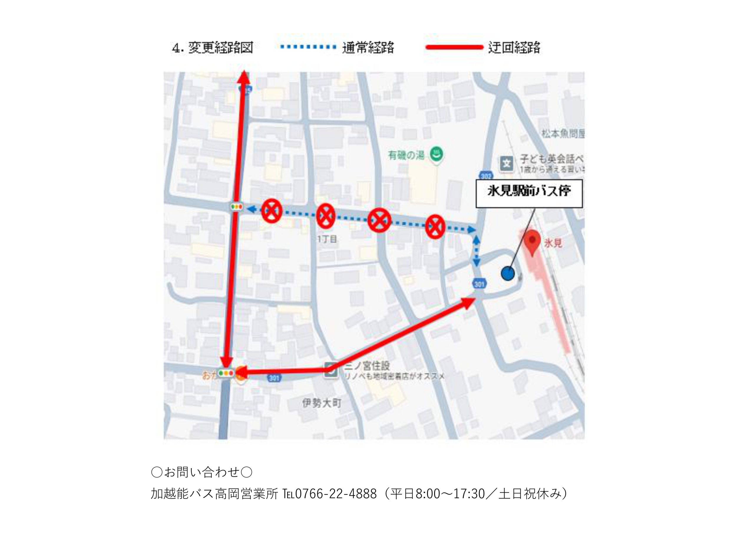 さんさんPARK実施に伴う氷見駅周辺経路変更について 2025.10.14 お知らせ 『さんさんPARK』開催に伴う経路変更について 平素より加越能バスをご利用いただきまして誠にありがとうございます。 通行規制の為、下記のとおり一部経路変更いたします。 ご利用のお客様には大変ご不便をおかけいたしますが、ご理解賜りますよう お願いいたします。 期 間 対象路線 【氷見市街地周遊バス】 期間 10月19日(日) 8:00~16:00 運行措置 一部の経路変更(氷見駅周辺) ← 前の記事へ 次の記事へ →