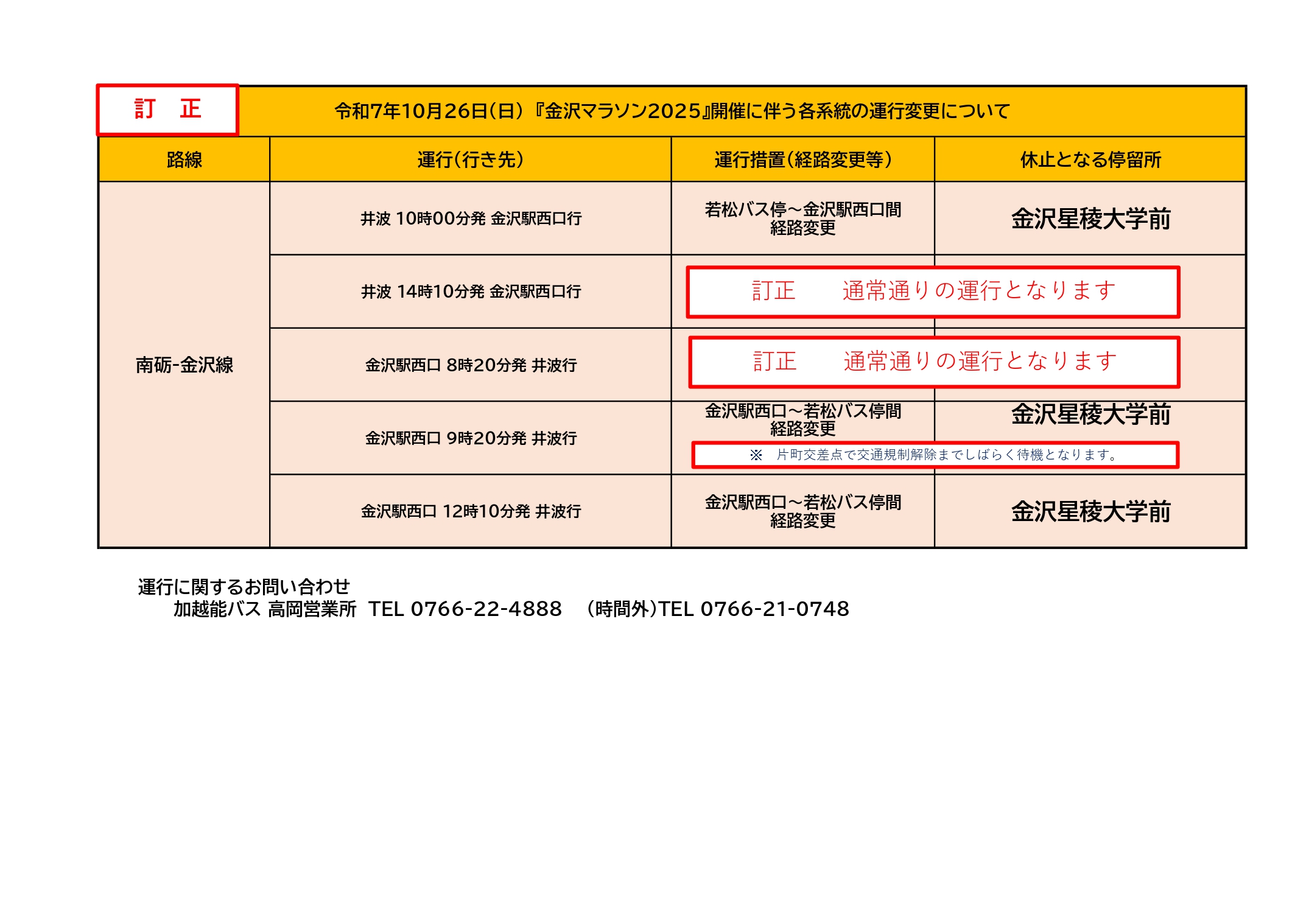 訂正:『金沢マラソン2025』開催に伴うバス運行について(10/26)