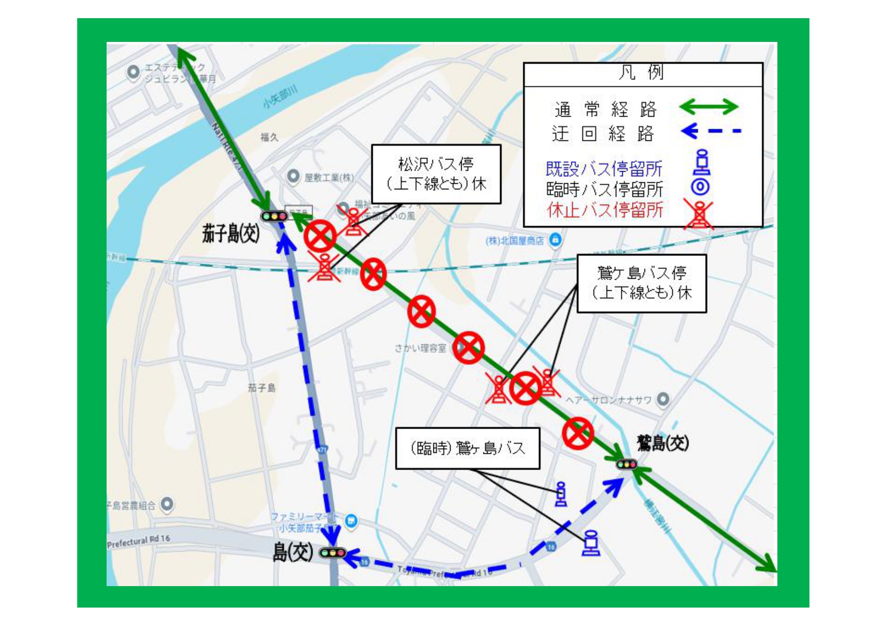 茄子島交差点付近工事に伴う経路変更について 2025.10.24 加越能バス株式会社 日頃より加越能バスをご利用いただき、誠にありがとうございます。 このたび茄子島交差点付近工事に伴う通行規制の為、経路変更いたします。 ご利用のお客様には大変ご不便をおかけいたしますが、ご理解賜りますようお願いいたします。 1.期 間 11月4日(火)~11月12日(水) 8:30~17:00 2.関係路線 若林線 3.休止停留所 松沢・鷲ヶ島(上下線ともに) ※臨時鷲ヶ島停留所を設置する。 4.変更経路図 下記のとおりとなります。 ← 前の記事へ 次の記事へ →