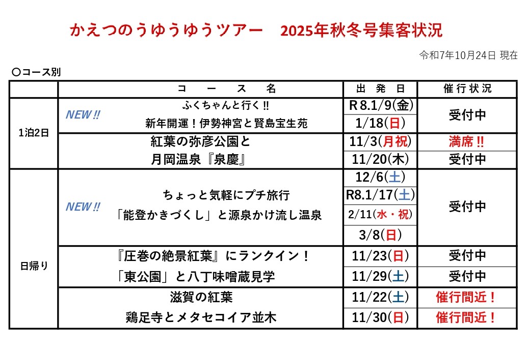 ゆうゆうツアー集客状況のご案内 2025.10.24 加越能バス株式会社 平素より加越能バスをご利用いただきまして誠にありがとうございます。 ゆうゆうツアーの集客状況をご案内いたします。 秋の紅葉コース絶賛募集中です。 皆様のご参加心よりお待ち申し上げます。 「ゆうゆうツアー」 ご予約はこちらをクリック ← 前の記事へ