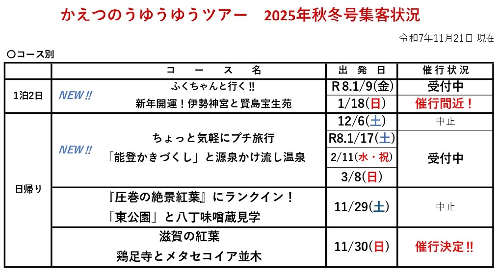 ゆうゆうツアー集客状況のご案内