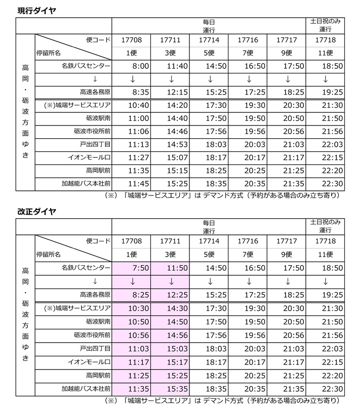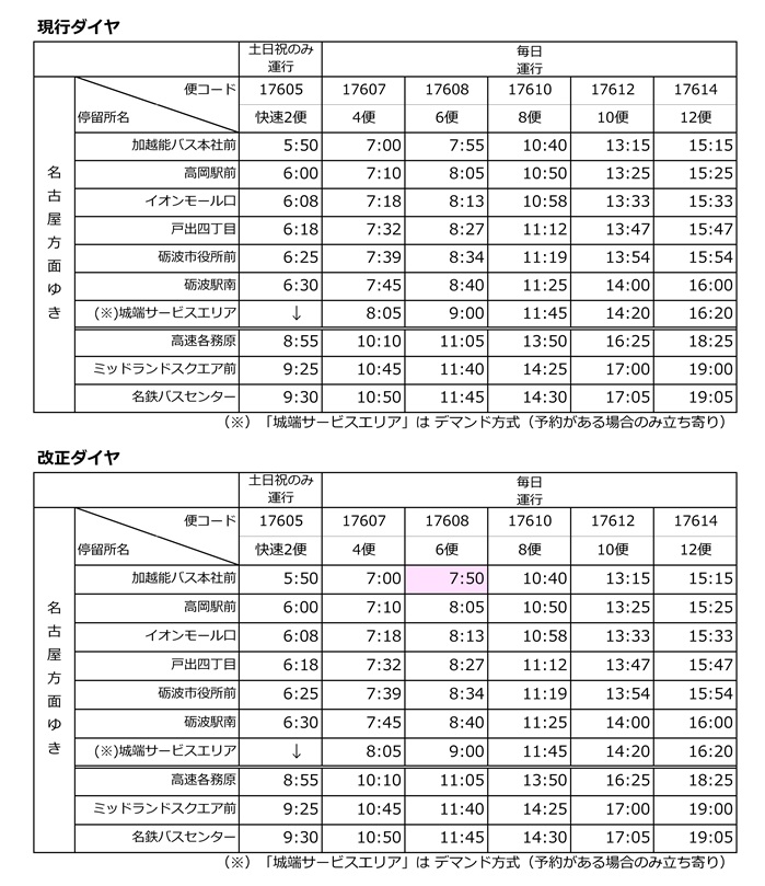 高速バス名古屋線 ダイヤ改正について 2026.2.20 平素より加越能バスをご利用いただきまして、誠にありがとうございます。 この度、高速バス名古屋線のダイヤ改正を令和8年4月1日に実施いたします。 ご利用のお客様はご注意ください。 改正日 令和8年4月1日(水)始発便より 改正時刻 【名古屋方面】 【高岡・砺波方面】 ← 前の記事へ 次の記事へ →