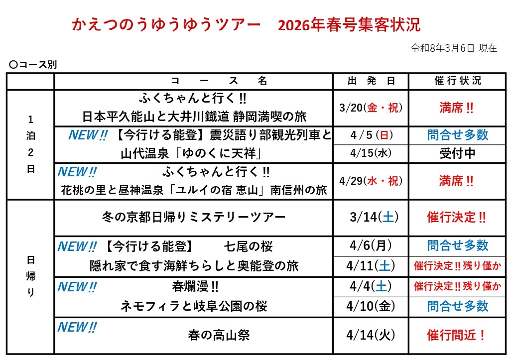 ゆうゆうツアー集客状況のご案内