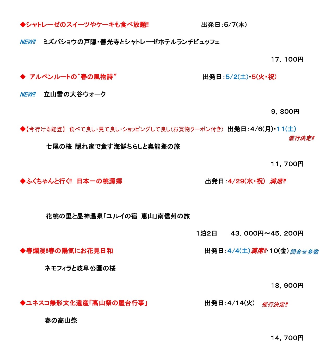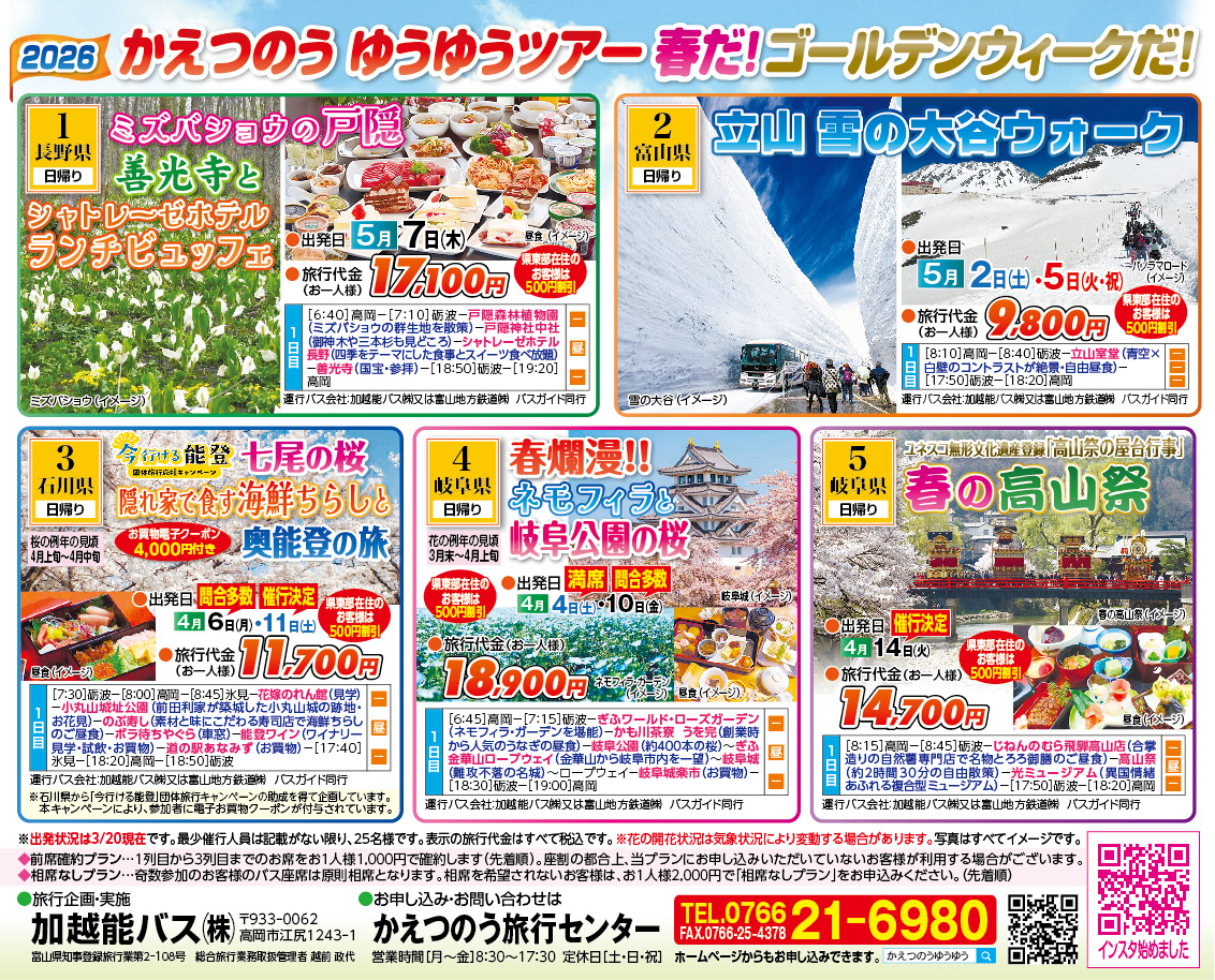 ゆうゆうツアー春・GW号受付開始しました。 2026.3.18 加越能バス株式会社 平素より加越能バスをご利用いただきまして誠にありがとうございます。 弊社旅行センターでは「ゆうゆうツアー春・GW号」の受付開始しました。 皆様のご参加を心よりお待ちしております。 ← 前の記事へ