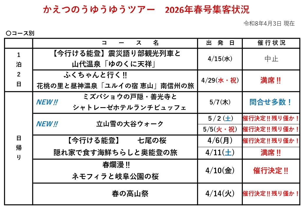 ゆうゆうツアー集客状況のご案内